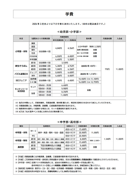 学費のご案内(2026年3月以降)